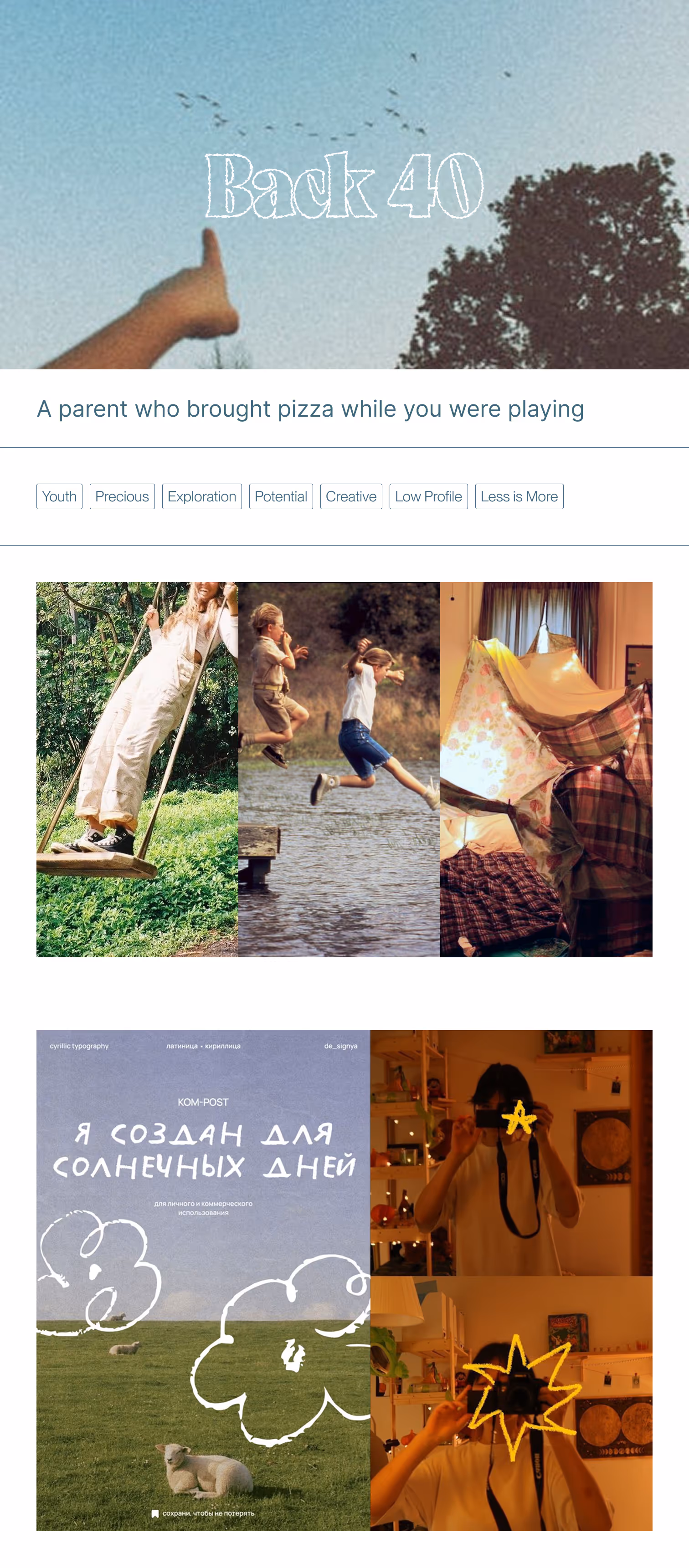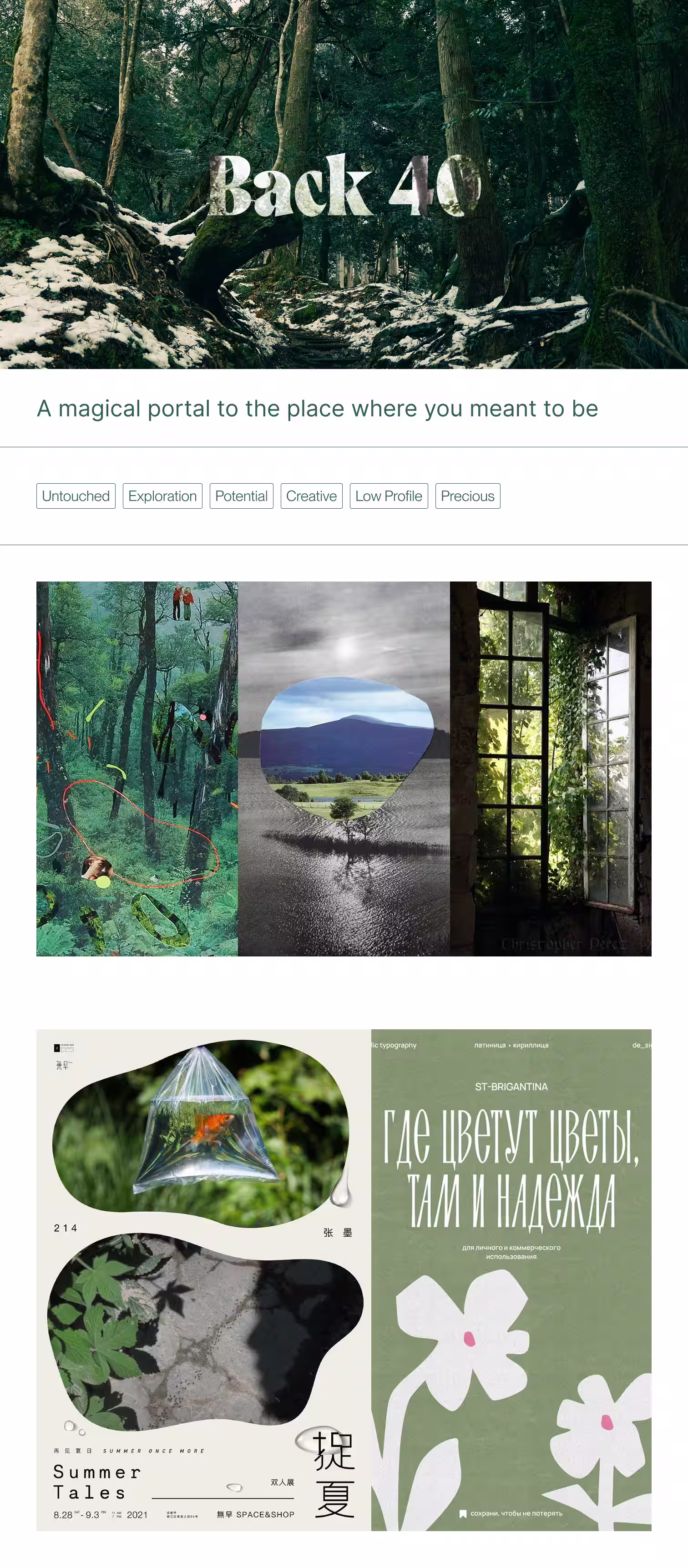 The chosen direction blended Magical Portal with hand-touched details and gentle typography. It became the foundation for both the visual identity and web layout. The final design language for Back 40 centers around the idea of quiet discovery — where even small support can open unexpected worlds. Circular and organic portal shapes cut through imagery like windows into overlooked stories, echoing the foundation’s mission to uplift under-the-radar youth work.