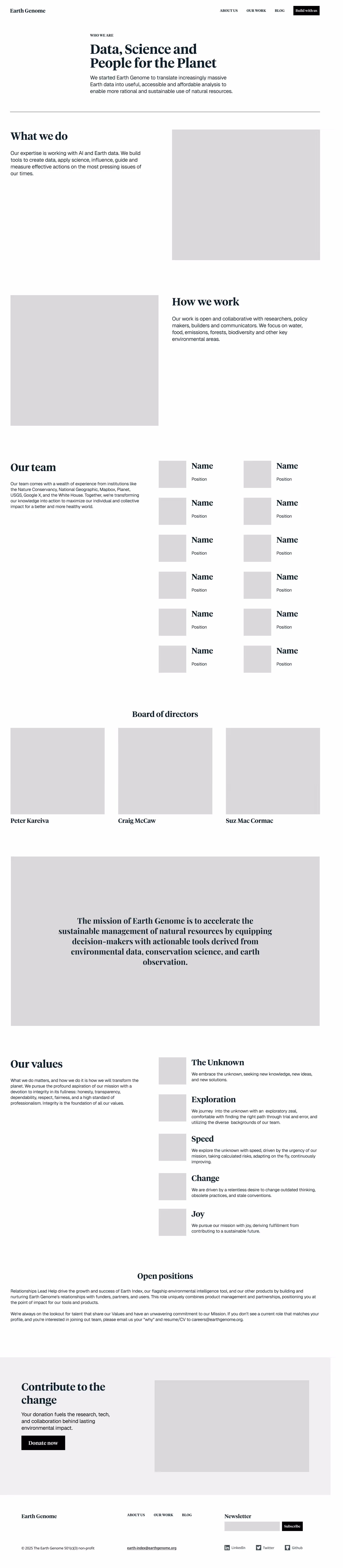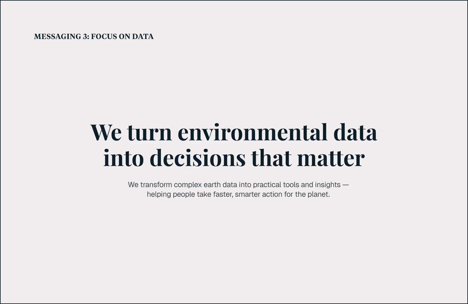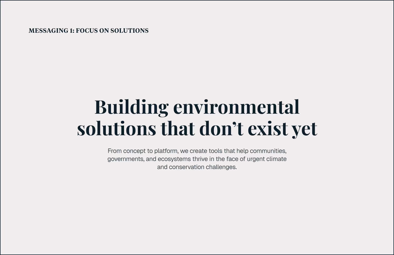 We explored three distinct messaging directions — solutions, collaboration, and data — to clarify how Earth Genome communicates its mission. Each direction emphasized a different facet of the organization’s identity: its proactive impact, its collaborative model, and its data-driven approach. This process helped surface language that resonates across audiences and informed the tone, structure, and storytelling of the new website.