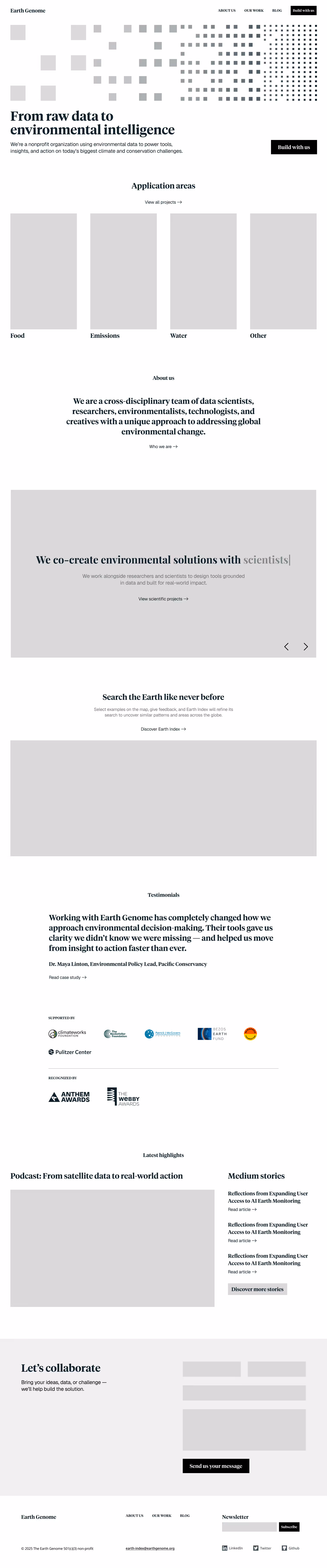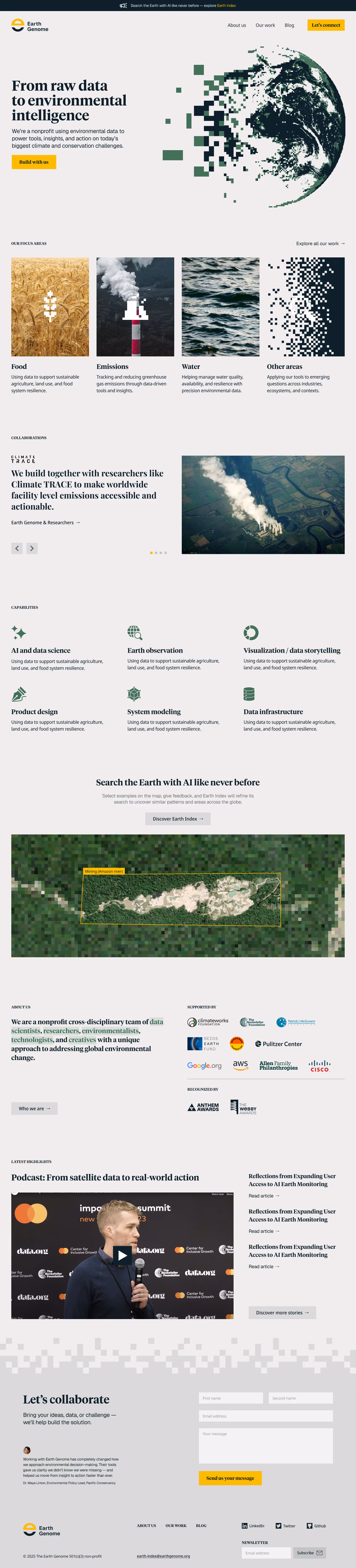 The new Earth Genome site clarifies the org’s mission, elevates its tools, and connects projects to outcomes. It now serves as a flexible hub for showcasing both current tools and new collaborations — helping EG build momentum and visibility with funders, partners, and mission-aligned orgs.