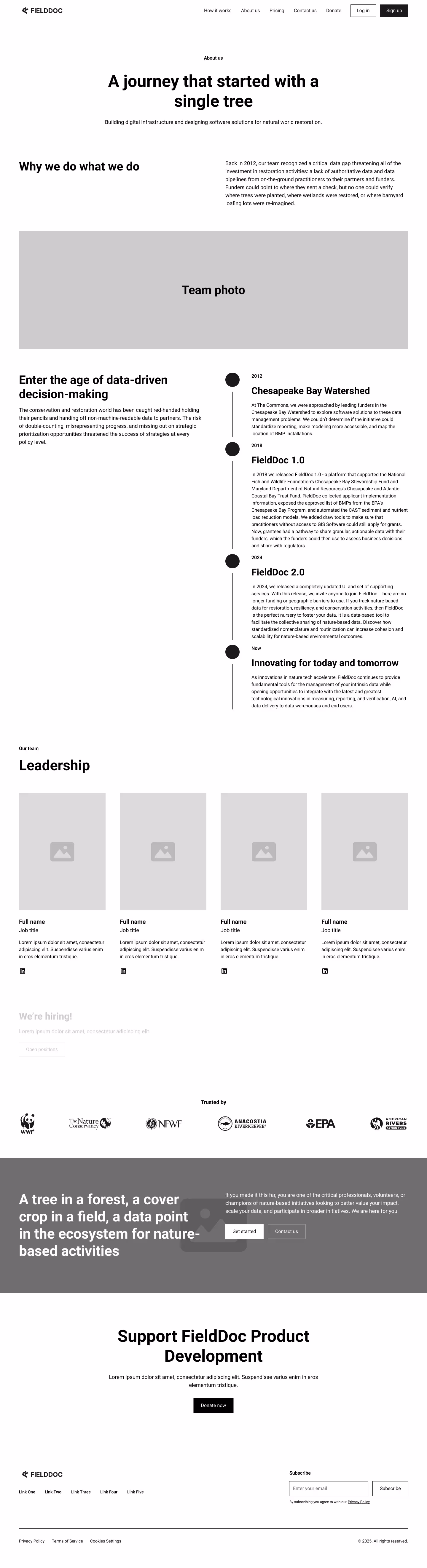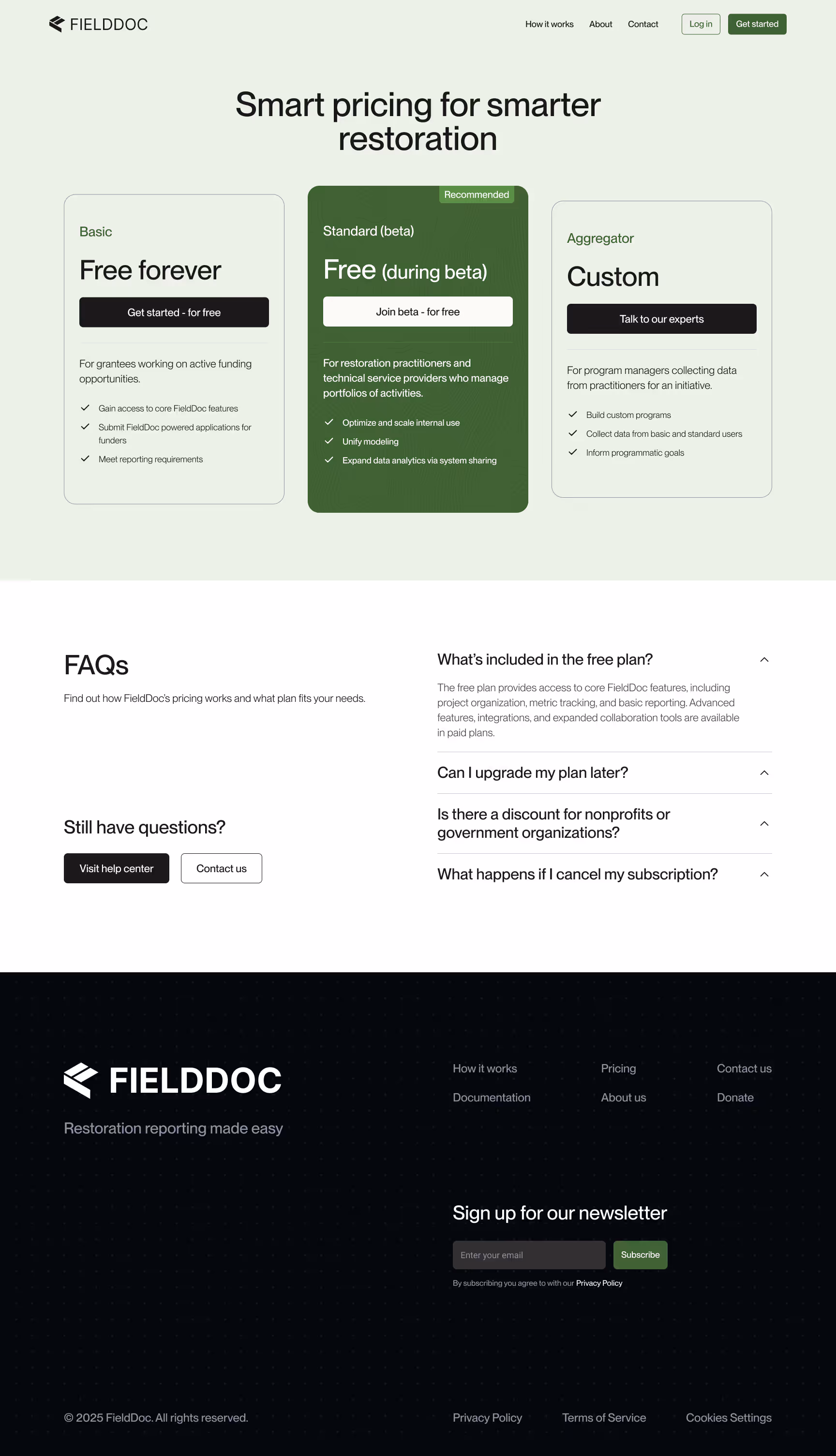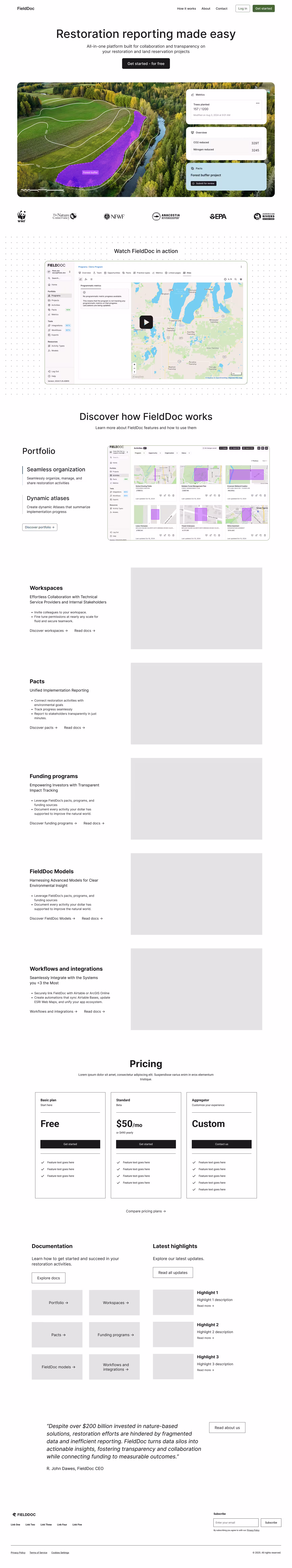 We began with a deep dive into FieldDoc’s identity, values, and evolving user needs. The platform sits at the intersection of environmental data, restoration reporting, and investment accountability — so the challenge was to bridge the technical with the accessible.