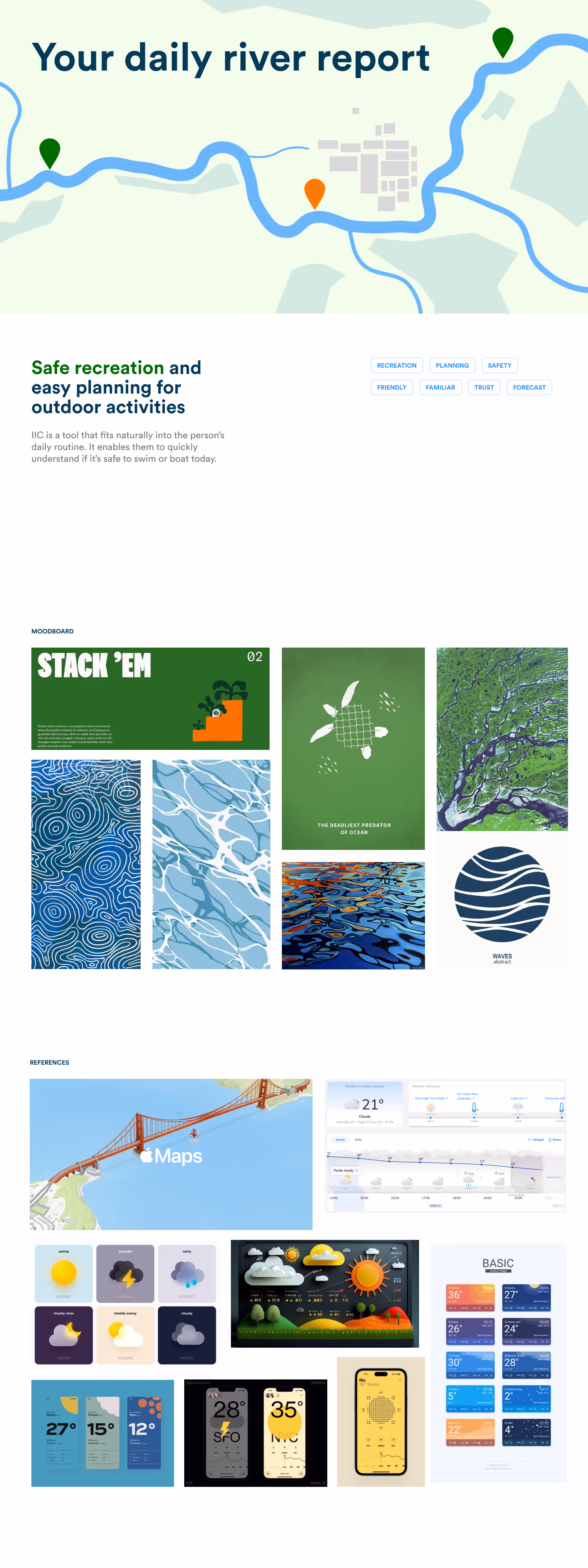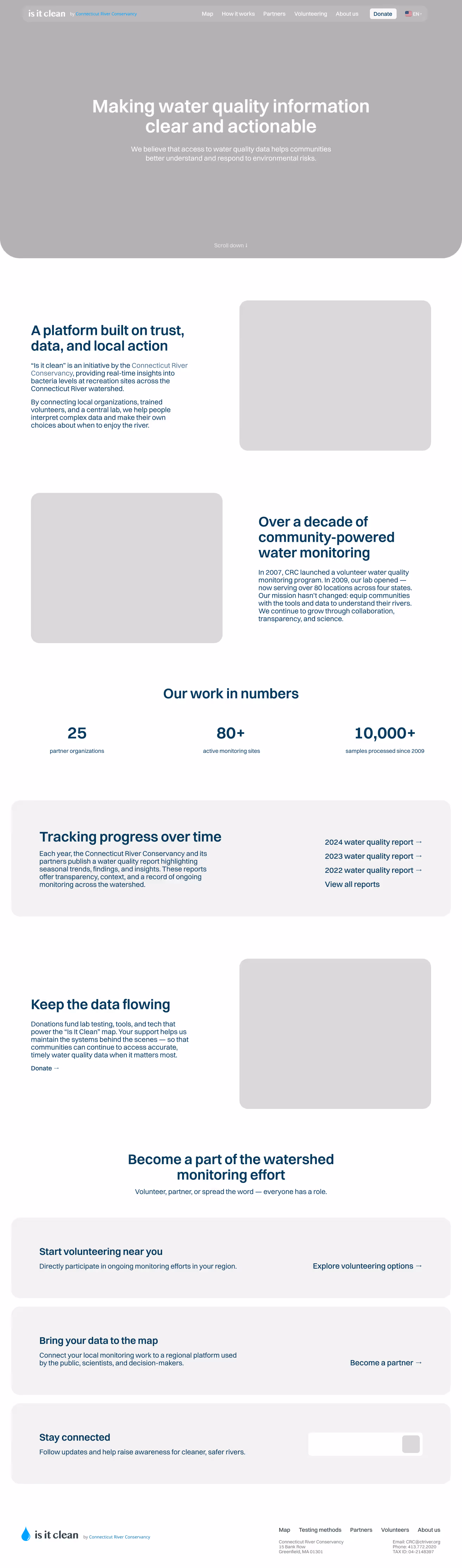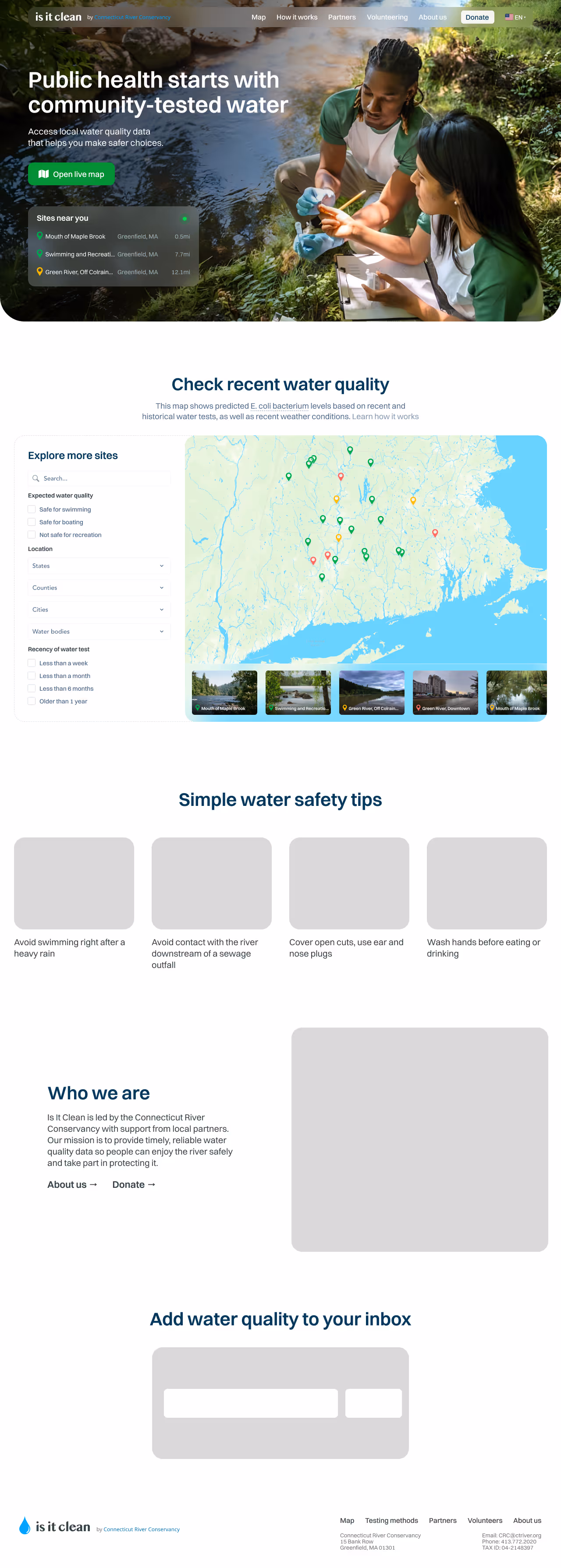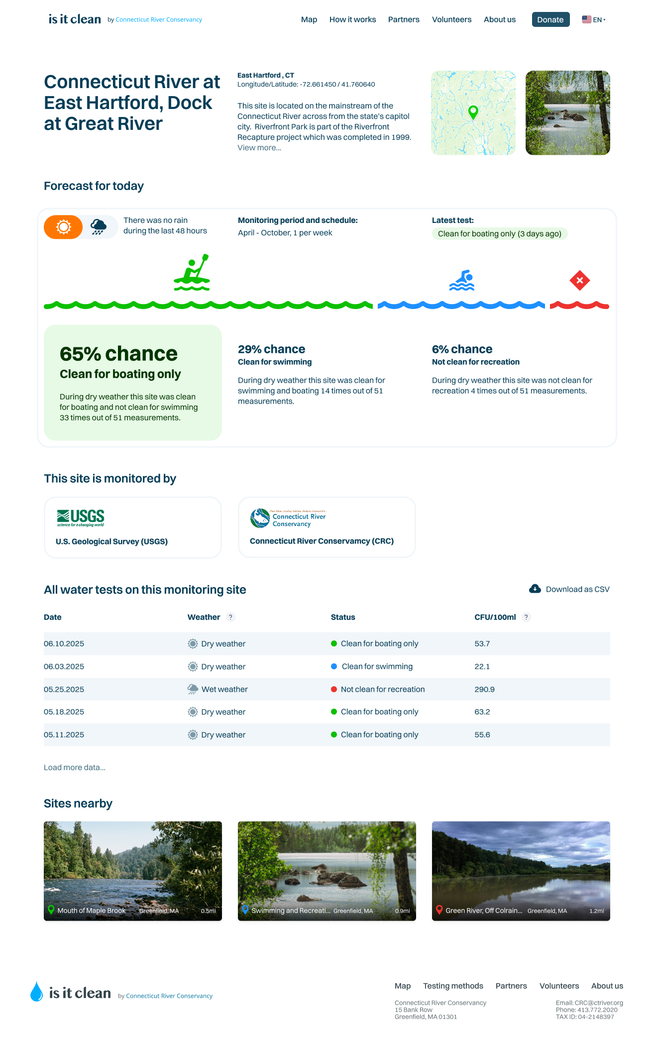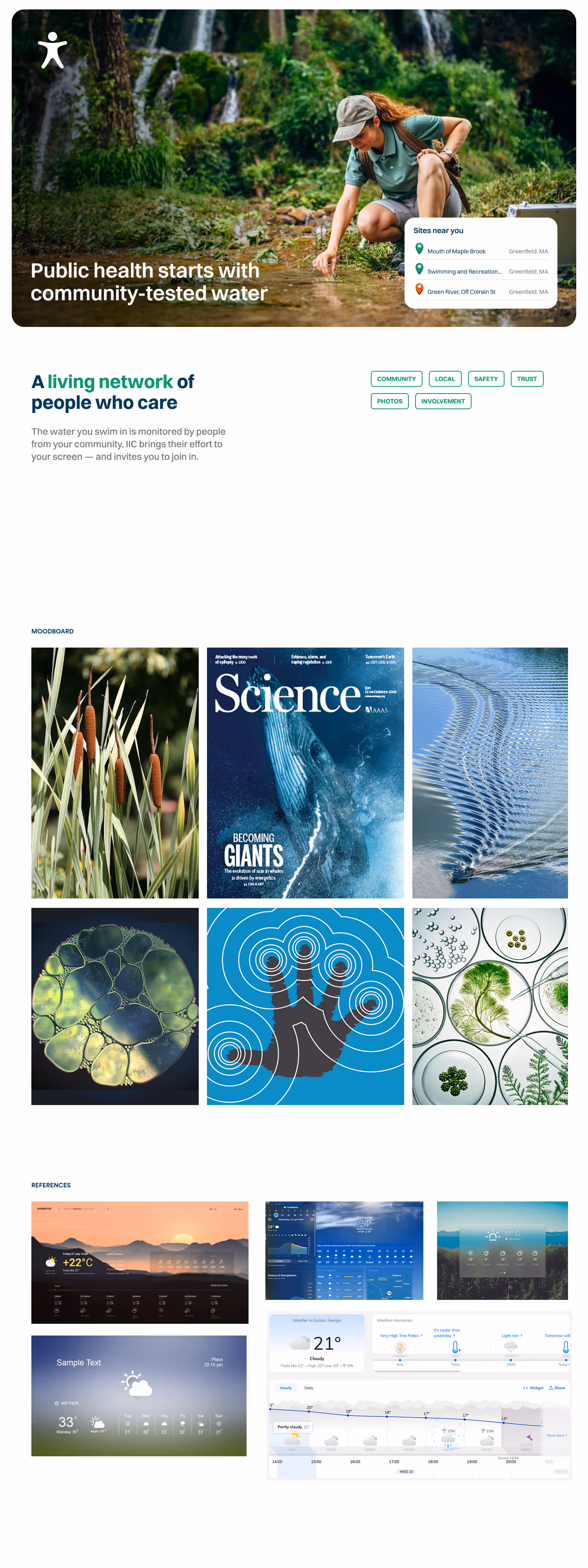 Our kickoff revealed a key insight: IsItClean.org is often the first or only touchpoint with CRC. Visitors range from local swimmers checking for safe spots to environmental partners accessing sampling data. Two main design directions were explored: